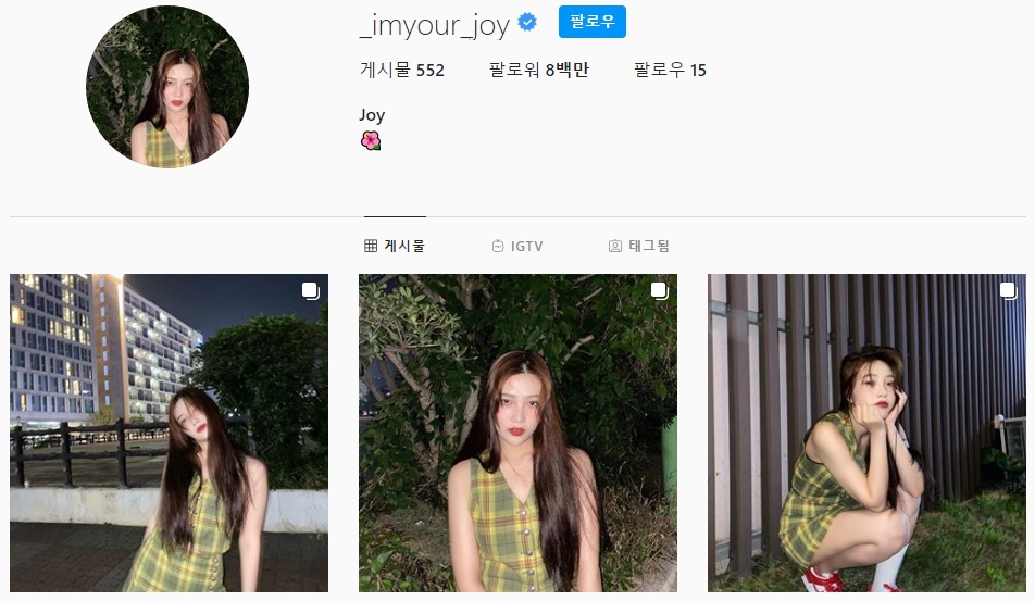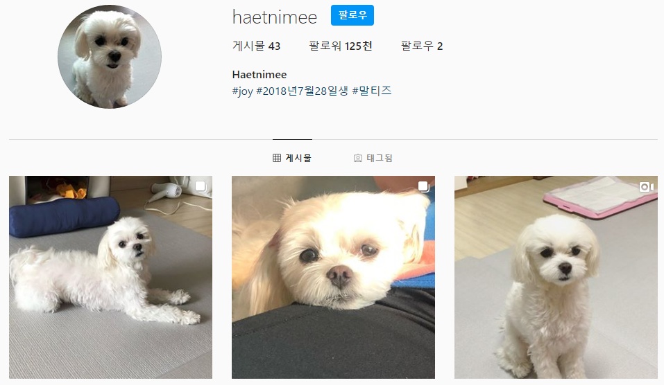 조이의 인스타그램 계정은 _imyour_joy이고 반려견 햇님이 인스타계정은 haetnimee이다.