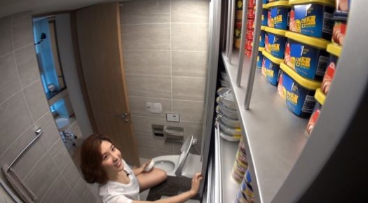 그중에서도 손님용 화장실이 아닌 부부 화장실을 공개하던 중 선반에 오뚜기 햄, 통조림 등이 발견됐다.