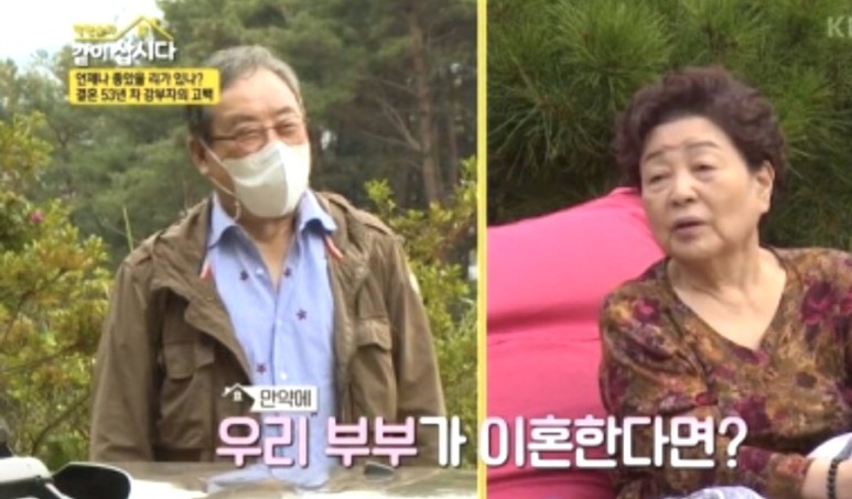 강부자는 "우리 부부가 헤어졌다고 하면 '남편 이묵원이 많이 참았겠지'라고 할 거다. '강부자가 좀 극성스럽냐. 그 부인과 사느라 애썼겠지'라고 하겠지만 나는 내가 많이 참고 살았다"라고 그간 남편과 살아오면서 느꼈던 힘들었던 속내를 털어놨다.