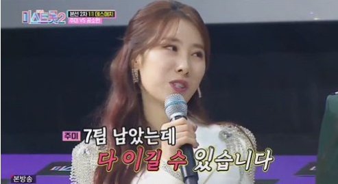 주미는 “공소원 너 나와, 7팀 남았는데 다 이길 수 있다. 재도전하신 분 ‘미스트롯2’는 우리가 지킨다는 의미로 뽑았다”라고 밝혔다.
