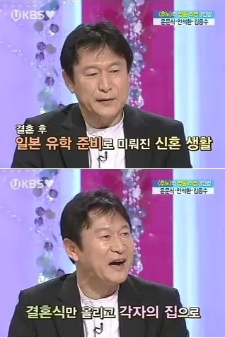 김응수는 아내와의 첫만남을 공개했는데 사회초년생 시절을 떠올린 김응수는 "신혼집이 없었다. 일본 유학을 준비하고 있었고 아내는 친정, 나는 형 집에 얹혀 살았다. 나중에 아내가 일본으로 건너왔다"며 "깊이 사랑해서 일본으로 온 건 모르겠다"고 너스레를 떨었다.