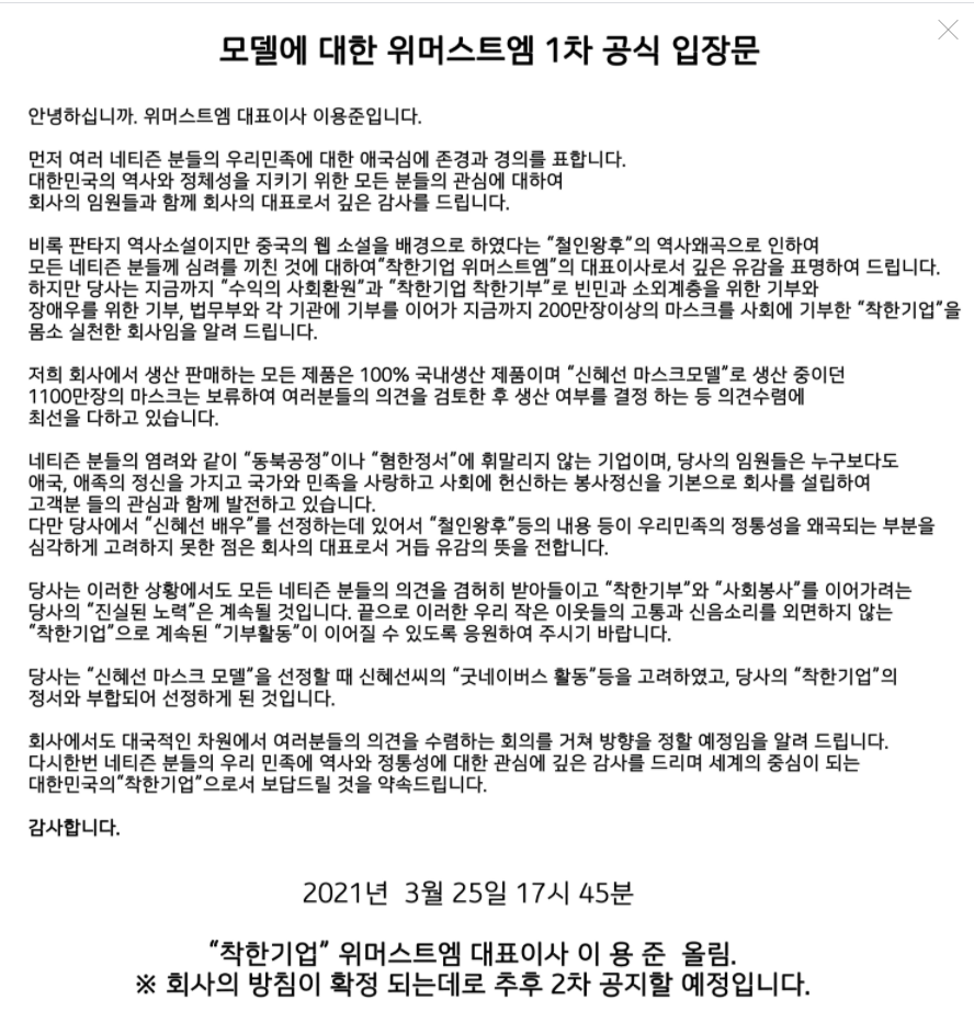 위머스트엠 측은 "신혜선 배우를 (모델로) 선정하는데 있어서 '철인왕후'에서 우리 민족의 정통성을 왜곡되는 부분을 심각하게 고려하지 못한 점은 회사 대표로서 거듭 유감의 뜻을 전한다"고 밝혔다. 이어 "당시 신혜선 씨의 굿네이버스 활동을 고려해 당사의 '착한기업' 정서와 부합돼 선정하게 된 것"이라고 밝혔다.
