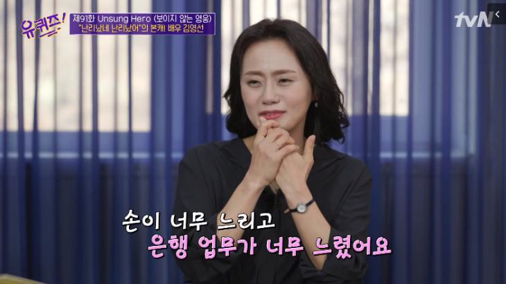 김영선은 "남편과 결혼을 하고 은행을 그만뒀다. 숫자에 약해 은행 업무가 너무 느렸다"라며 직장을 그만뒀던 이유를 설명했다.