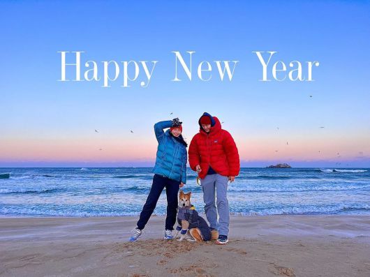 이기우는 글과 함께 공개한 사진 속에는 이기우와 그의 아내, 그리고 반려견 테디가 일출을 보기 위해 바닷가를 찾은 모습이 담겨있다.