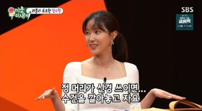 이어 임수향은 "집에서 안나가면 청결하고 집에만 있는 날에 청결하다"며 "정 머리가 신경 쓰일 땐 수건을 깔고 잔다"고 했다. 이어 "몸은 좀 씻는데 머리는 좀 너무 그러면 머릿결에 안좋다"고 너스레를 떨었다.