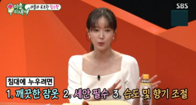 신동엽은 임수향에 대해 " 자취한지 13년 차 인데 '여자 서장훈'이라고 하더라. 깨끗한 취침을 위해 잘 준비만 1시간을 한다던데"라고 물었고 임수향은 "깨끗한 잠옷에 세안은 필수다. 아로마도 뿌리고 가습기에 물도 채워서 조도와 습도를 다 맞추는 편이다"라고 밝혔다.