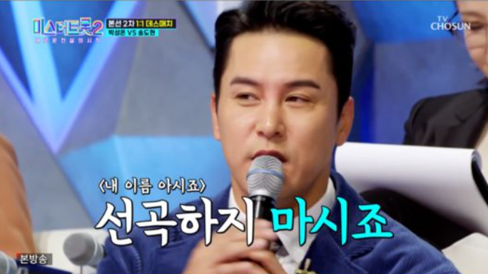 미스터트롯2 1:1 데스매치에서 선공 박성온은 장민호의 '내 이름 아시죠'를 열창했다. 박성온은 절절하고 애틋한 마음을 가사에 꾹꾹 담아 불렀다.