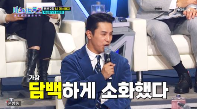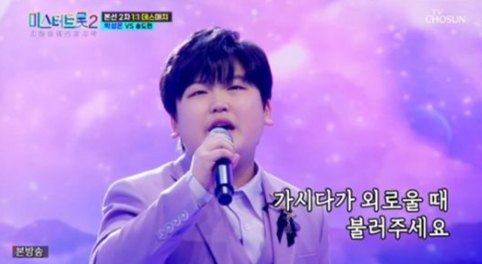 '미스터트롯2'는 본선 2차 1:1 데스매치가 이어졌고 히든싱어에서 진짜 가수인 송가인을 이긴 것으로 유명한 박성온은, 송도현과 맞붙게 되었다.