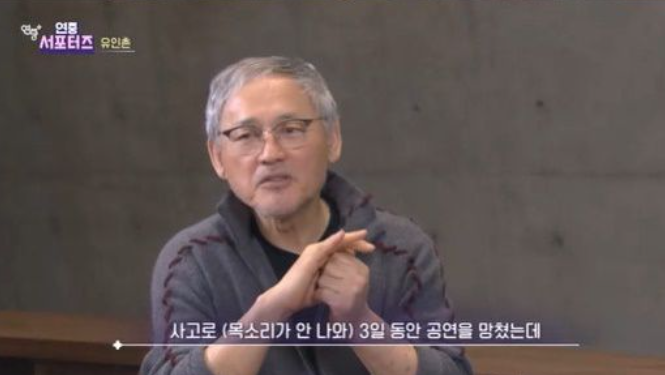 이어 유인촌은 "사고로 목소리가 안 나와 3일 동안 공연을 완전 망쳤는데 정말 죽고 싶었다. 도망갈 수도 없고. 연극을 보러 왔던 관객들은 분명히 그런 저를 기억할 거다. 그분들은 다시 안 올 거다. 그때 정말 죄송했다. 그게 너무 마음이 아팠다."라고 덧붙였다.