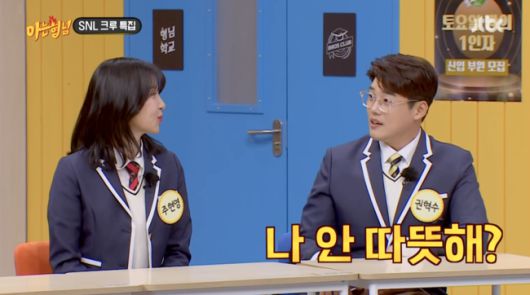 그러자 권혁수는 “나 안 따뜻하냐”고 물었고, 주현영은 “따뜻하지”라고 웃으며 답했다. 그 찰나 주현영의 눈빛이 달달하자 형님들은 "뭔가 이상하다", "진짜 가족되는 거 아니냐?", "둘이 따로 만난적 있느냐"고 질문했다.