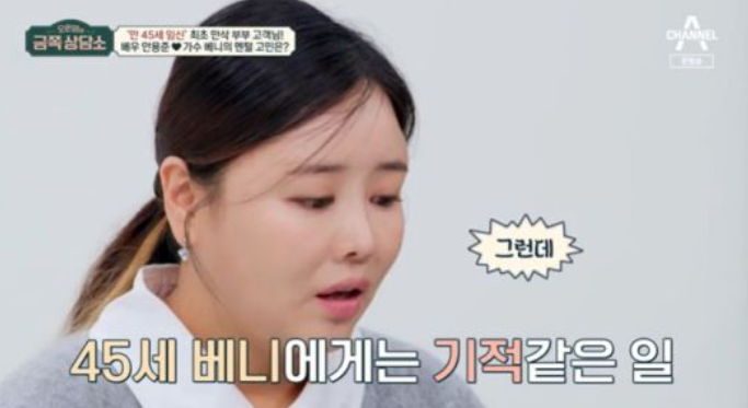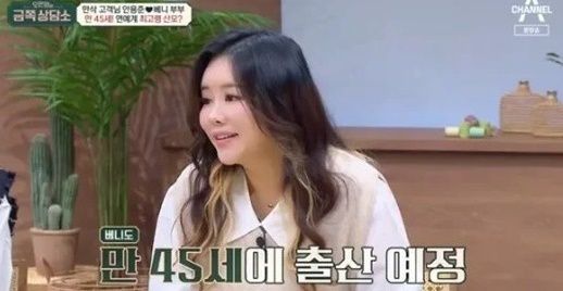 만삭의 몸으로 출연한 베니는 “현재 임신 7개월 차”라고 전했다. 결혼 8년 만에 아이가 생겼다는 그는 “만 45세에 출산 예정”이라며 ‘연예계 최고령 임산부’라고 자신을 소개했다.