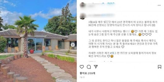 이어 "카페에서는 그 외 공연도 한다고 하니 많은 발걸음을 해 달라, 혹시 이 시기에 제주도 여행 가시는 분들은 꼭 들러보시라. 연인과 친구와 가족과 행복한 추억 만들고 오세요"라고 직접 카페 홍보에 나섰다.