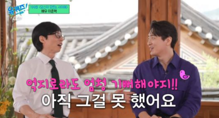 이준혁은 갑작스럽게 눈물을 흘렸고, "이러면 안 되는데"라며 당황했다. 유재석은 "우리가 만나서 이야기를 하지만 이 짧은 시간에 어떻게 다 하겠냐. '이런 행복감을 내가 표현하는 것이 맞는 것인가. 내 스스로 이럴 때 잘 가다듬어서 앞으로 해야 할 일에 대한 여러 가지 생각이 들어서 눈물이 나지 않았나' 하는 생각이 든다"라며 다독였다.