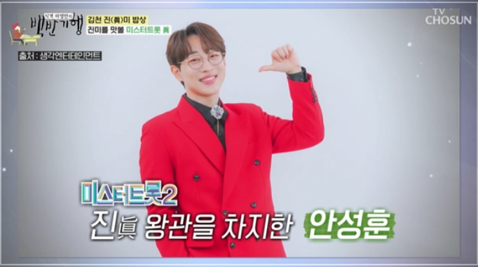 안성훈은 '미스터트롯' 시즌1에서 탈락한 후 '미스터트롯' 시즌2에 재도전해 진이 되며 인생역전했다. 그는 모두가 반대했지만 "재도전하지 않으면 일찍 떨어지는 상처보다 후회가 될 것 같았다"라고 말했다. 그러면서 "이렇게 행복해도 되나 싶을 정도로 행복하다"라고 말했다.