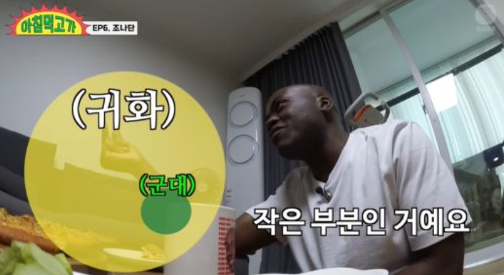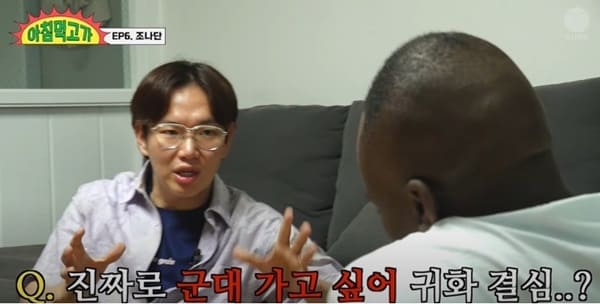 MC 장성규가 "귀화를 준비하고 있잖아"라며 "귀화하면 군대 가겠다는 얘기도 많이 했다"고 말하자, 조나단은 곤란한 미소와 함께 "형이라서 편하게 얘기하겠다"며 솔직한 얘기를 털어놨다.