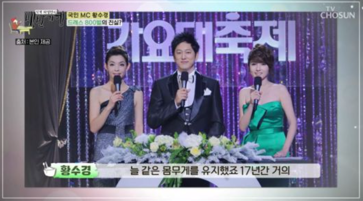수경은 17년간 장수 음악회를 진행해왔는데 이에 '드레수경'이라는 별명을 얻었다. 이에 황수경은 “17년을 하면서 드레스만 800벌 정도 입었다"라며 “슬림한 드레스 덕에 17년간 거의 같은 몸무게를 유지했다"고 말했다. 이어 “사람들이 제가 집에서도 드레스 입는 줄 안다"며 웃음을 자아냈다.