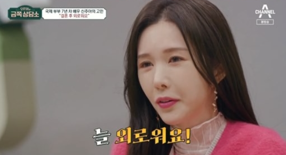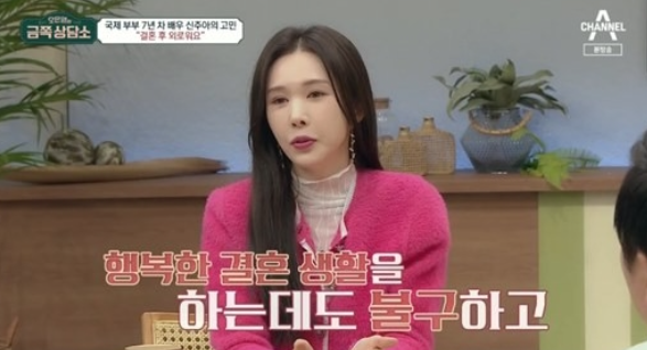 '금쪽상담소'에 나와서 "국제결혼 7년차다. 남편이 잘 해주고 있지만 늘 외롭다"라고 밝히기도 했다. 업무로 바쁜 사업가 남편에 홀로 있는 시간이 많고, 사업을 하려다가도 코로나로 무산되고 만 것. 오은영은 "신주아만이 할 수 있는 역할을 늘려야 한다"고 조언했다.