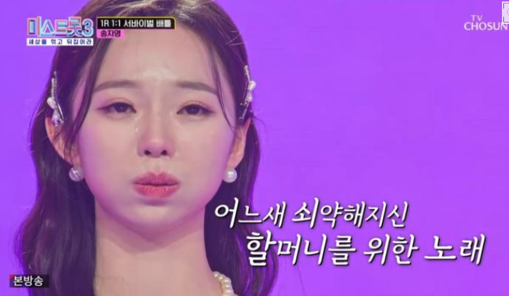 무대가 끝난 후 송자영은 "할머니를 위해 노래를 불렀다. 미스트롯3에 나온 이유도 할머니께 제 무대를 보여드리고 싶어서 나오게 되었다. 할머니께서 몸이 많이 편찮으셔서 앞으로 함께할 수 있는 시간이 많이 남지 않았다는 걸 알게 돼서 노래하는 모습을 보여드리고 싶었다"라며 눈물을 보였다.