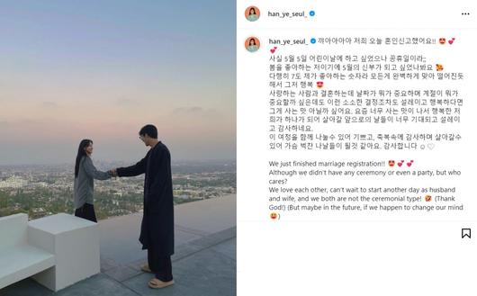 한예슬은 앞서 자신의 인스타그램을 통해 "저희 오늘 혼인신고했다. 사실 5월 5일 어린이날에 하고 싶었으나 공휴일이라... 봄을 좋아하는 아이기에, 5월의 신부가 되고 싶었나 보다”라며 혼인 신고했음을 전했다.