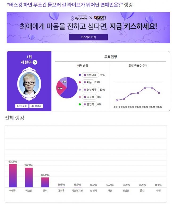 커뮤니티 포털사이트 디시인사이드와 취향 검색 기업 마이셀럽스가 운영 중인 ‘익사이팅 디시'측은 ‘버스킹 하면 무조건 들으러 갈 라이브가 뛰어난 연예인’의 랭킹 순위를 공개했다.